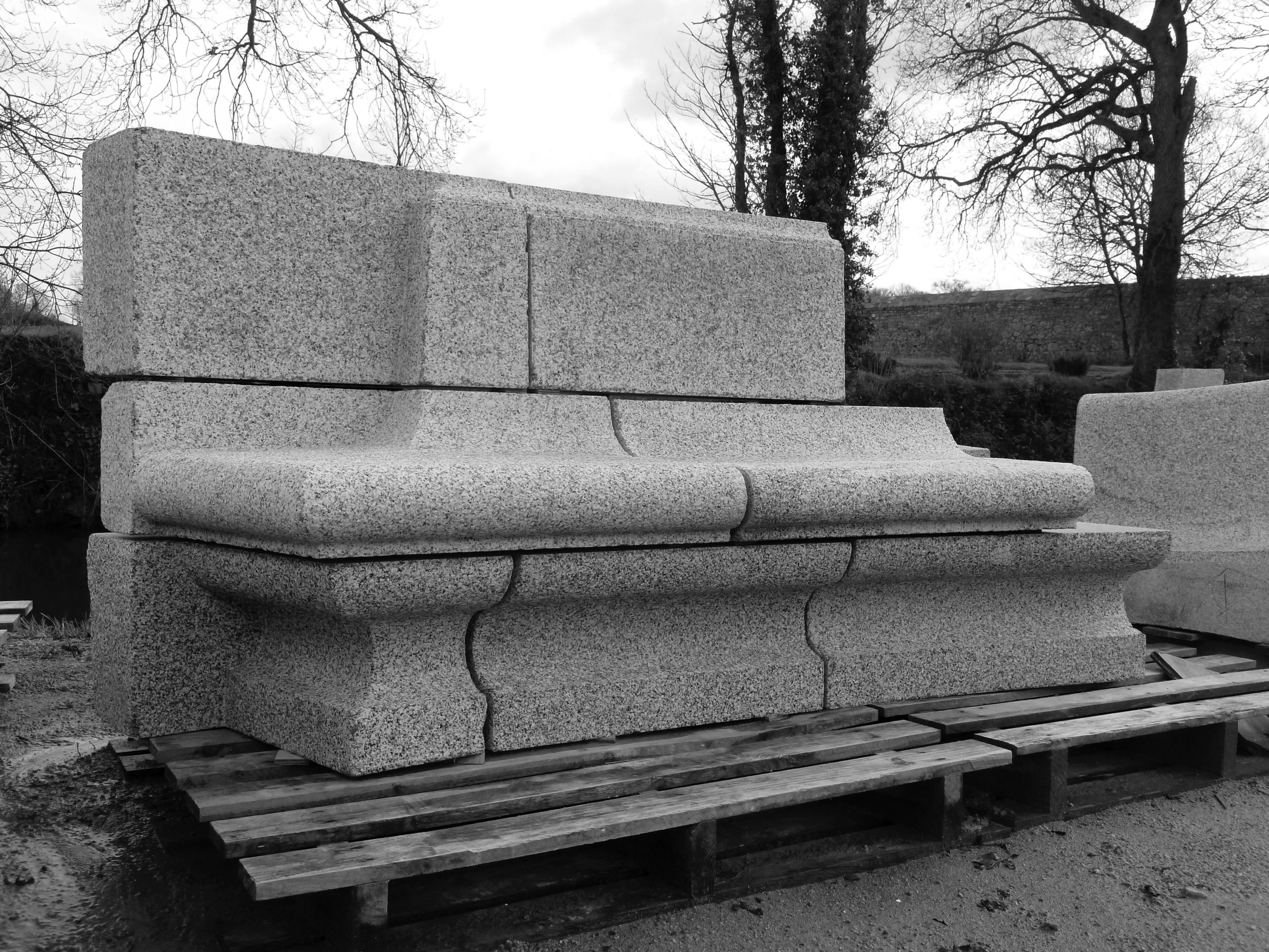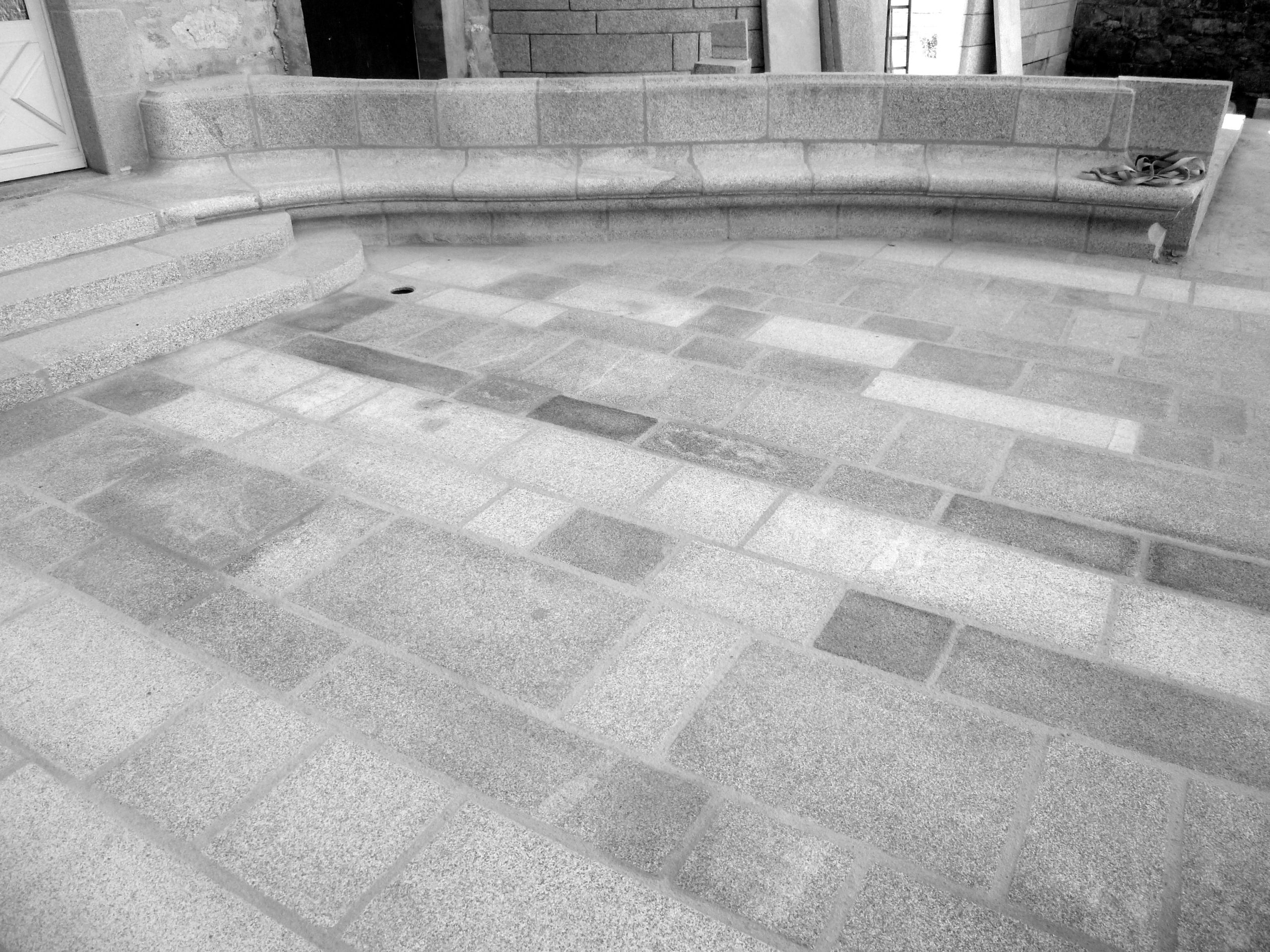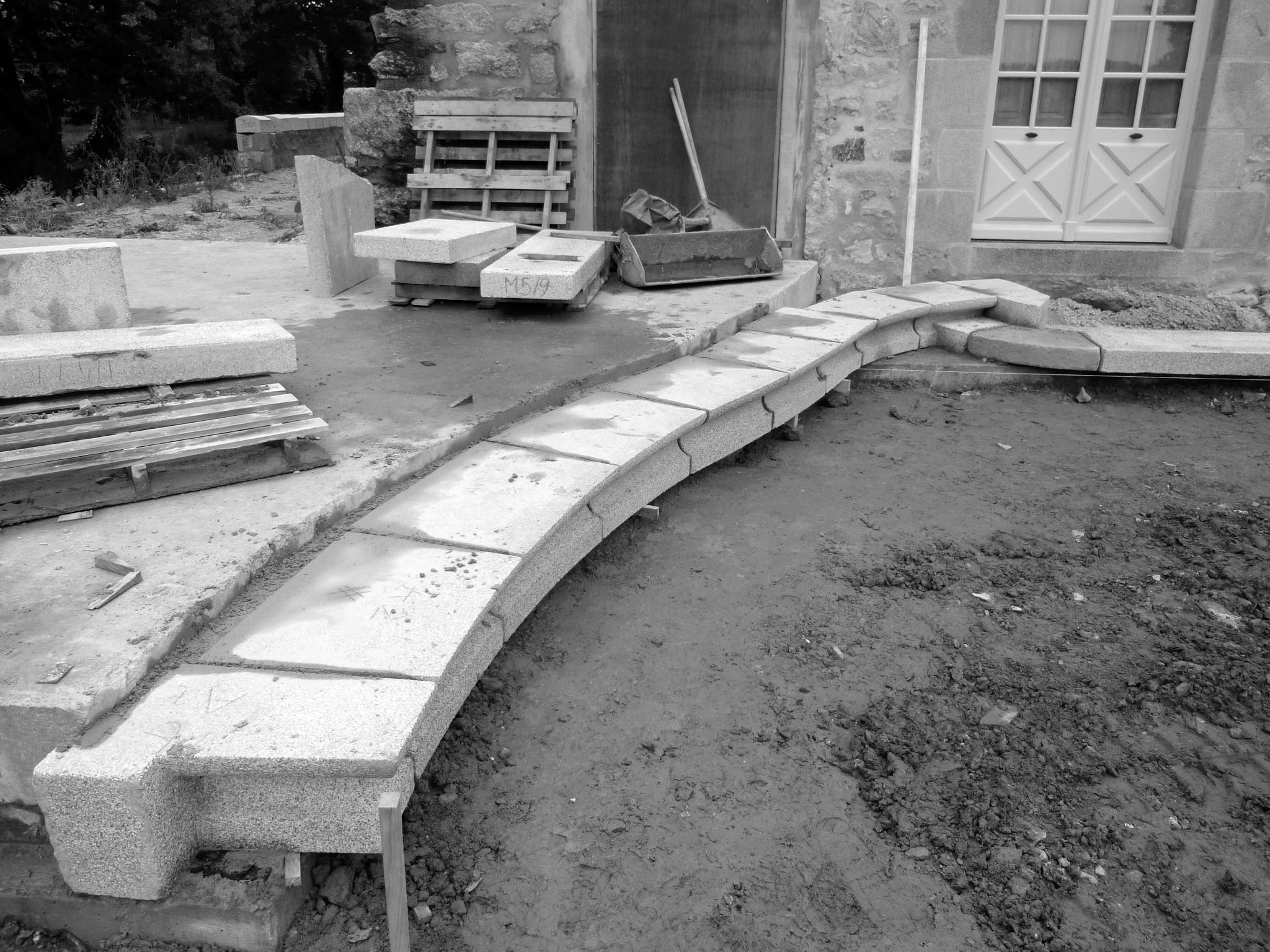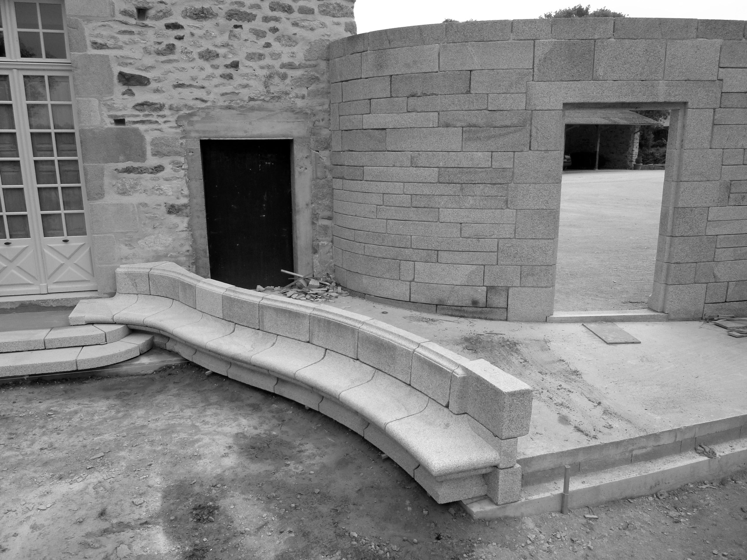 Création d'une terrasse en Granite de Languédias. Bancs courbes dont le design est inspiré des bancs du Pont-neuf à Paris.