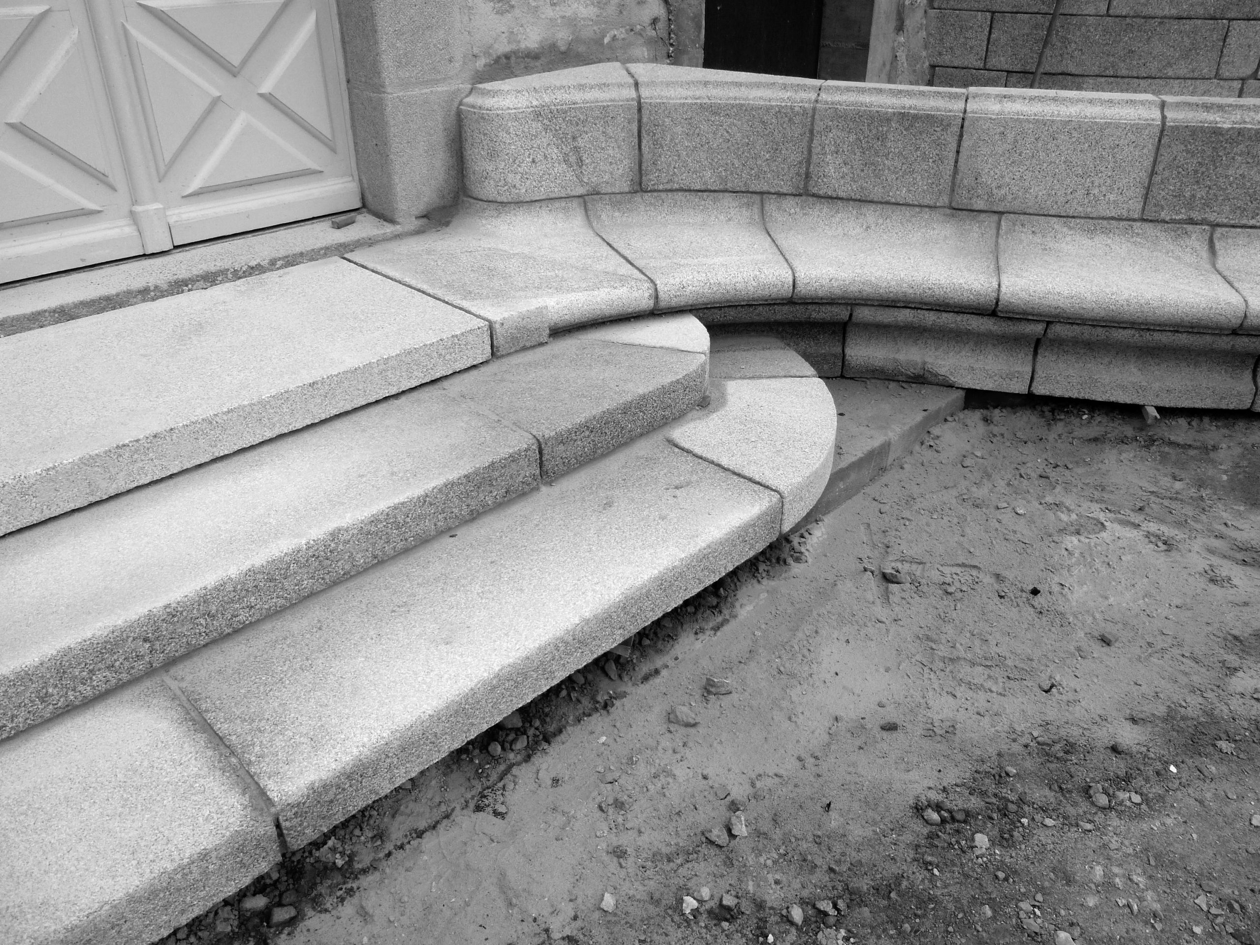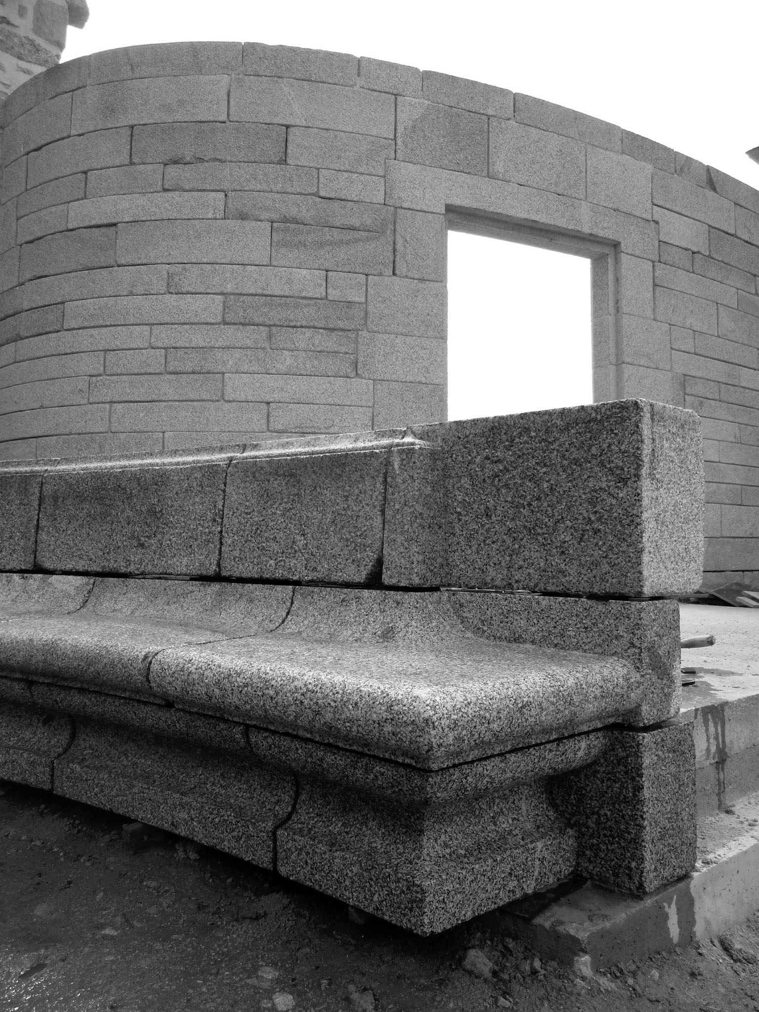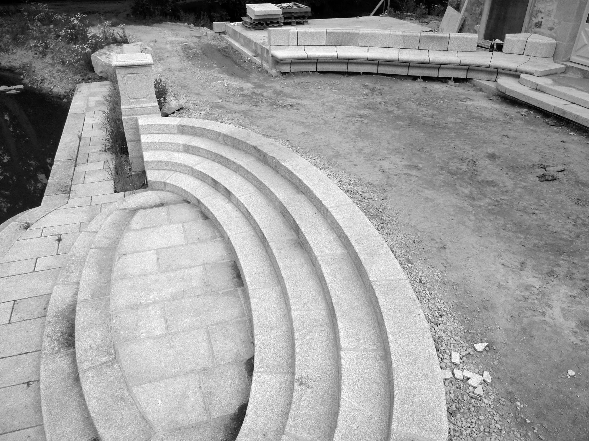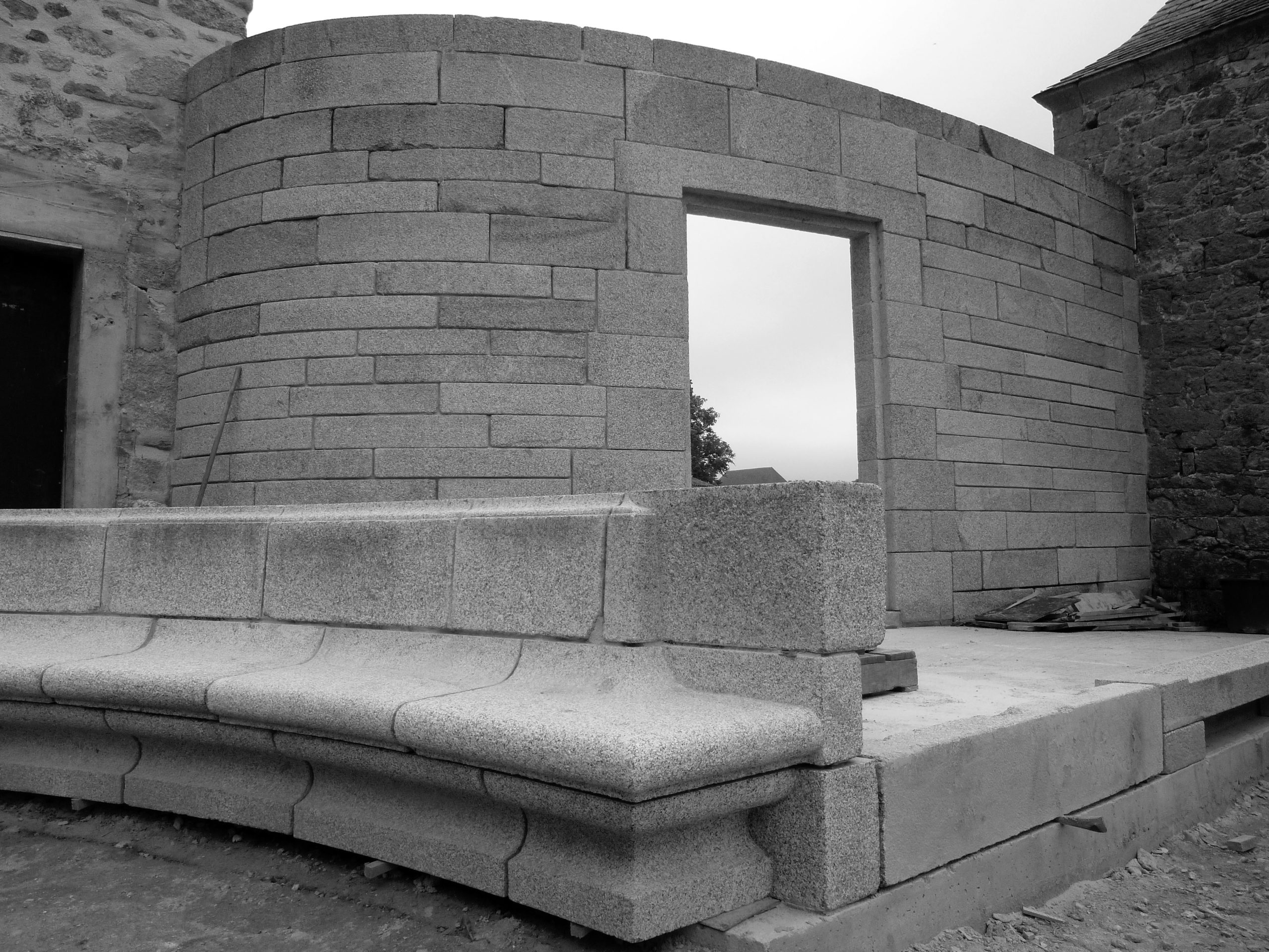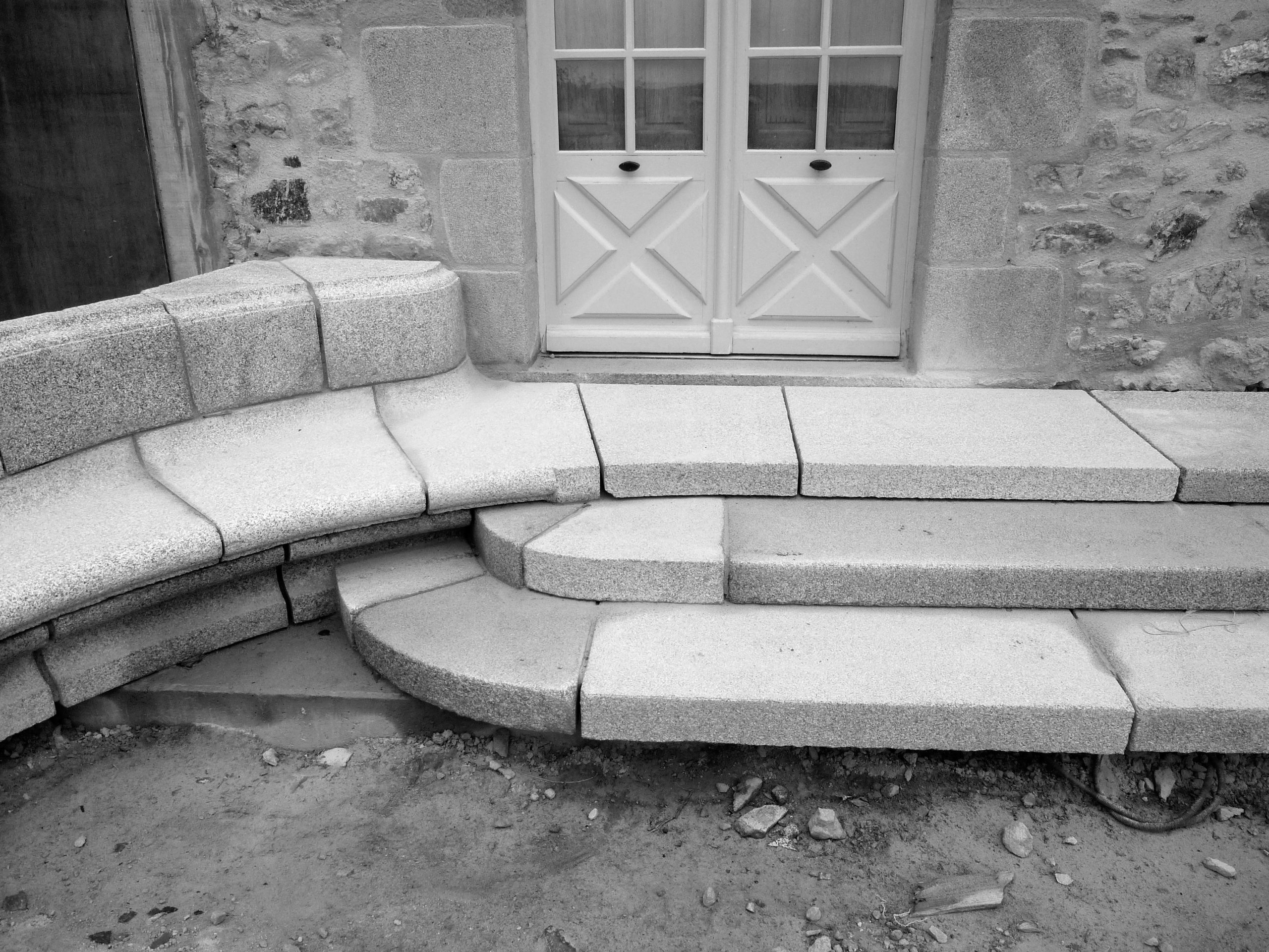 Création d'une terrasse en Granite de Languédias. Bancs courbes dont le design est inspiré des bancs du Pont-neuf à Paris.