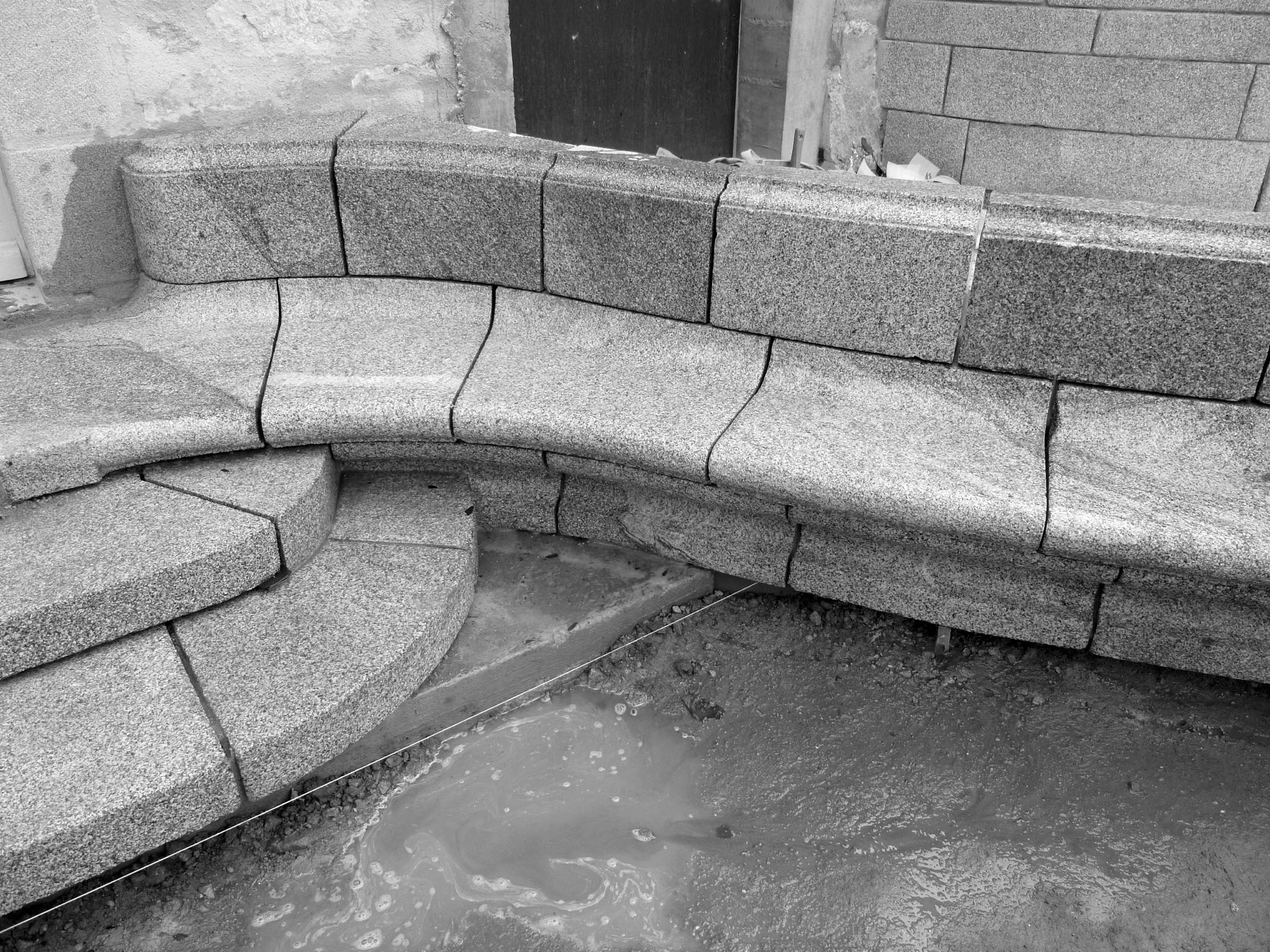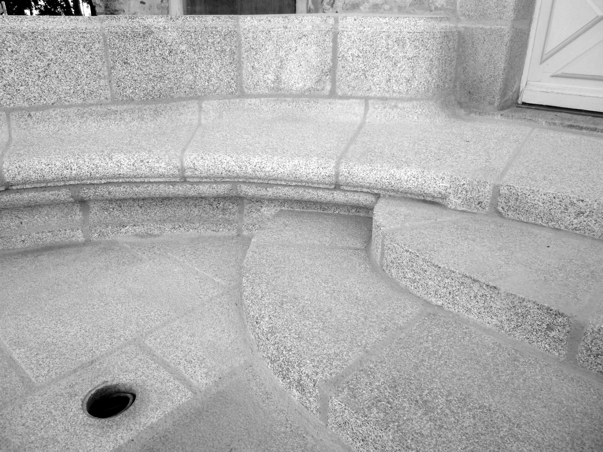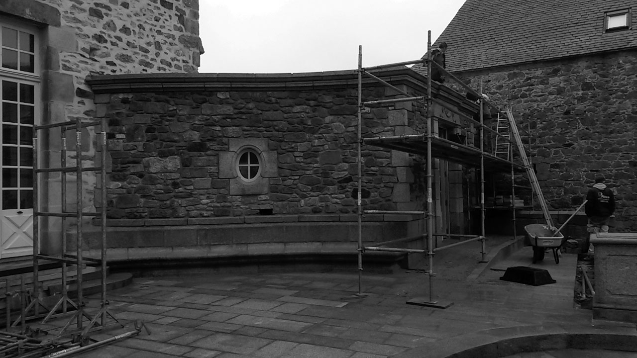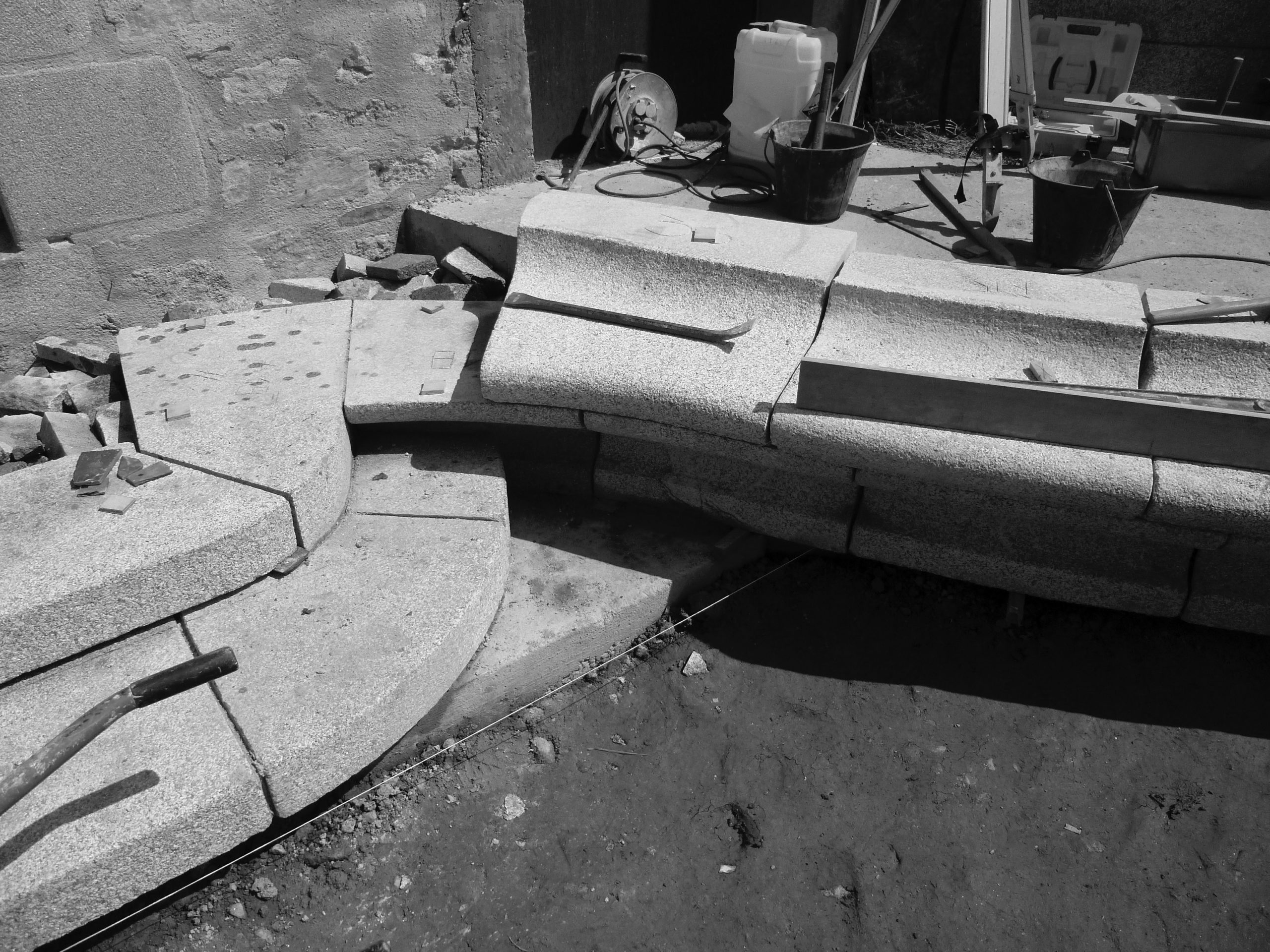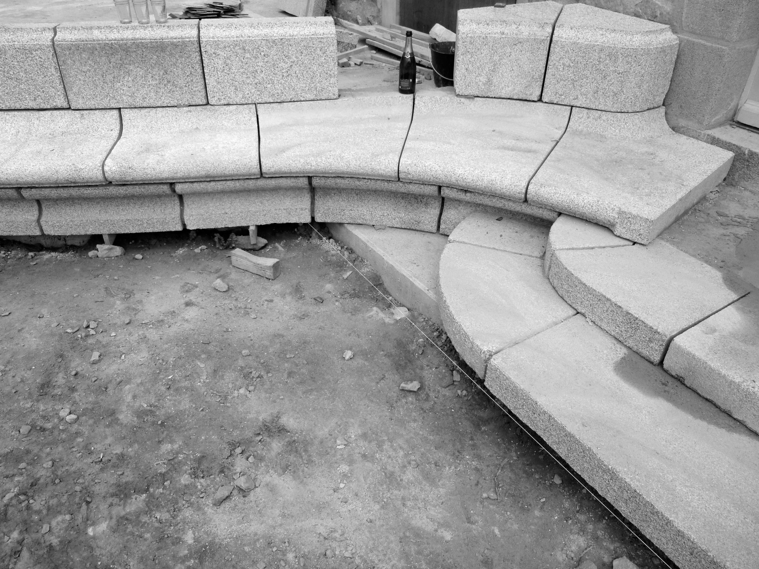 Création d'une terrasse en Granite de Languédias. Bancs courbes dont le design est inspiré des bancs du Pont-neuf à Paris.