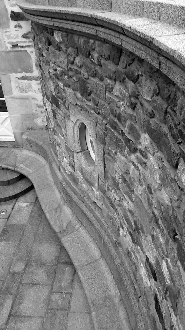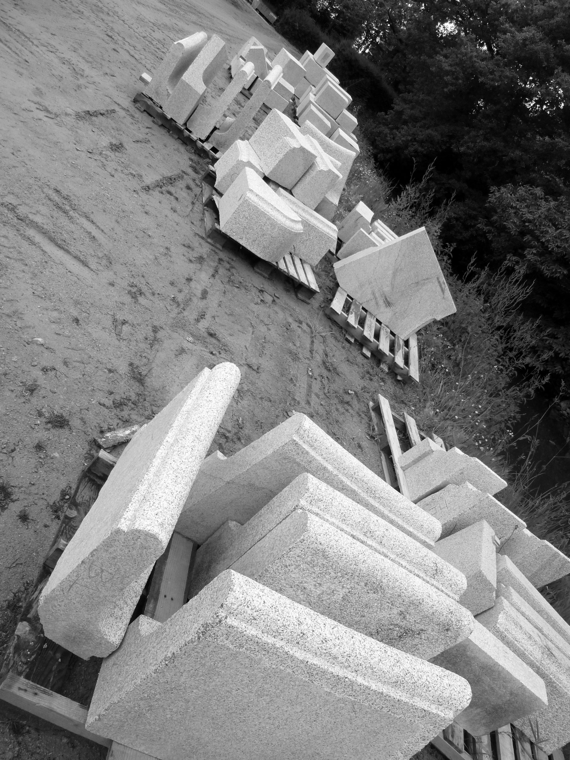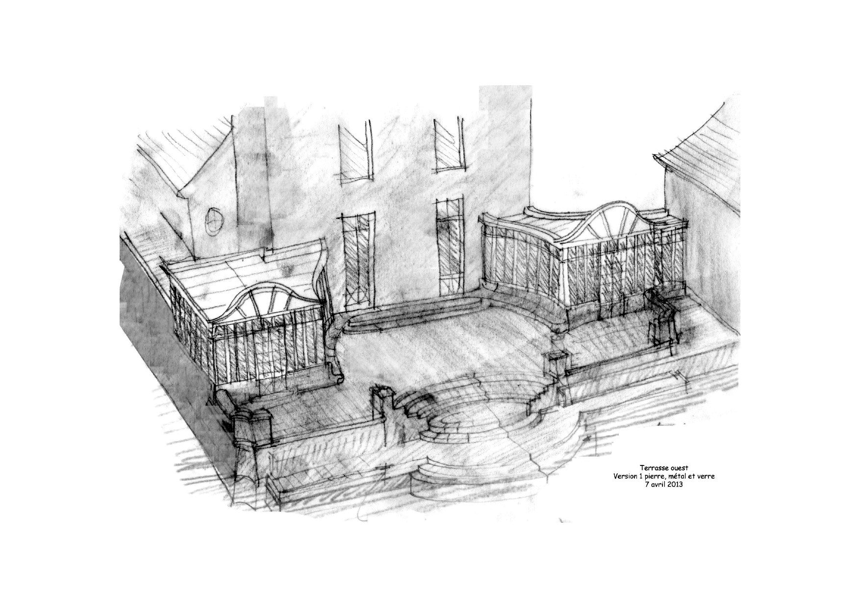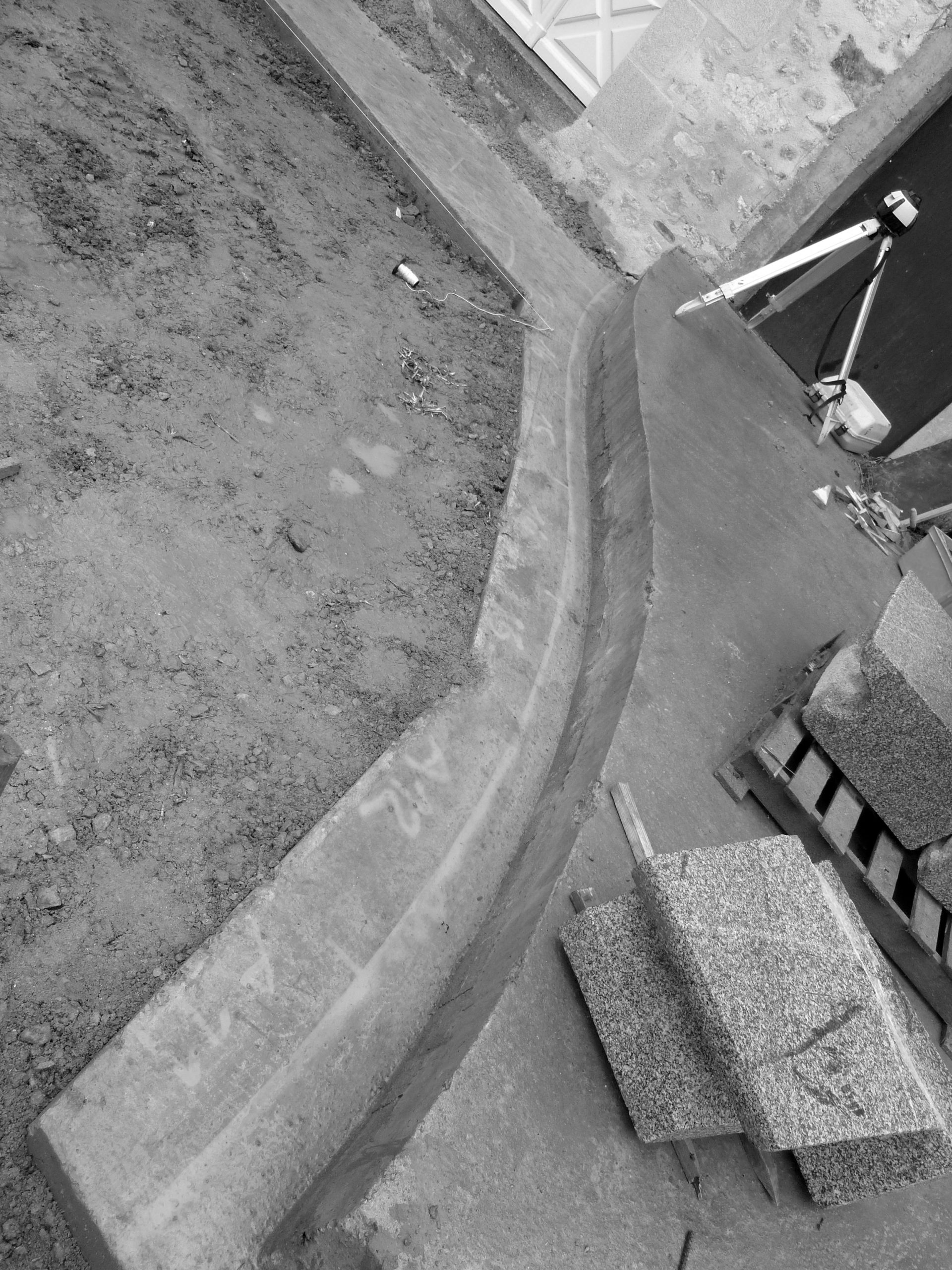 Création d'une terrasse en Granite de Languédias. Bancs courbes dont le design est inspiré des bancs du Pont-neuf à Paris.