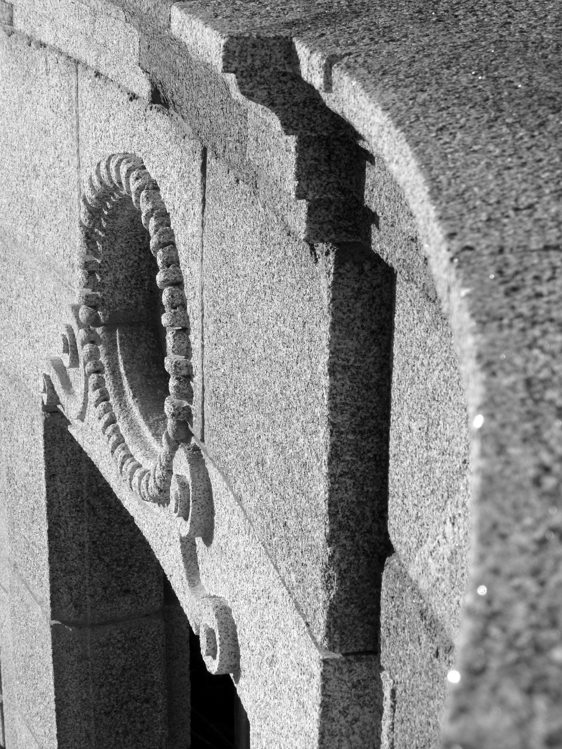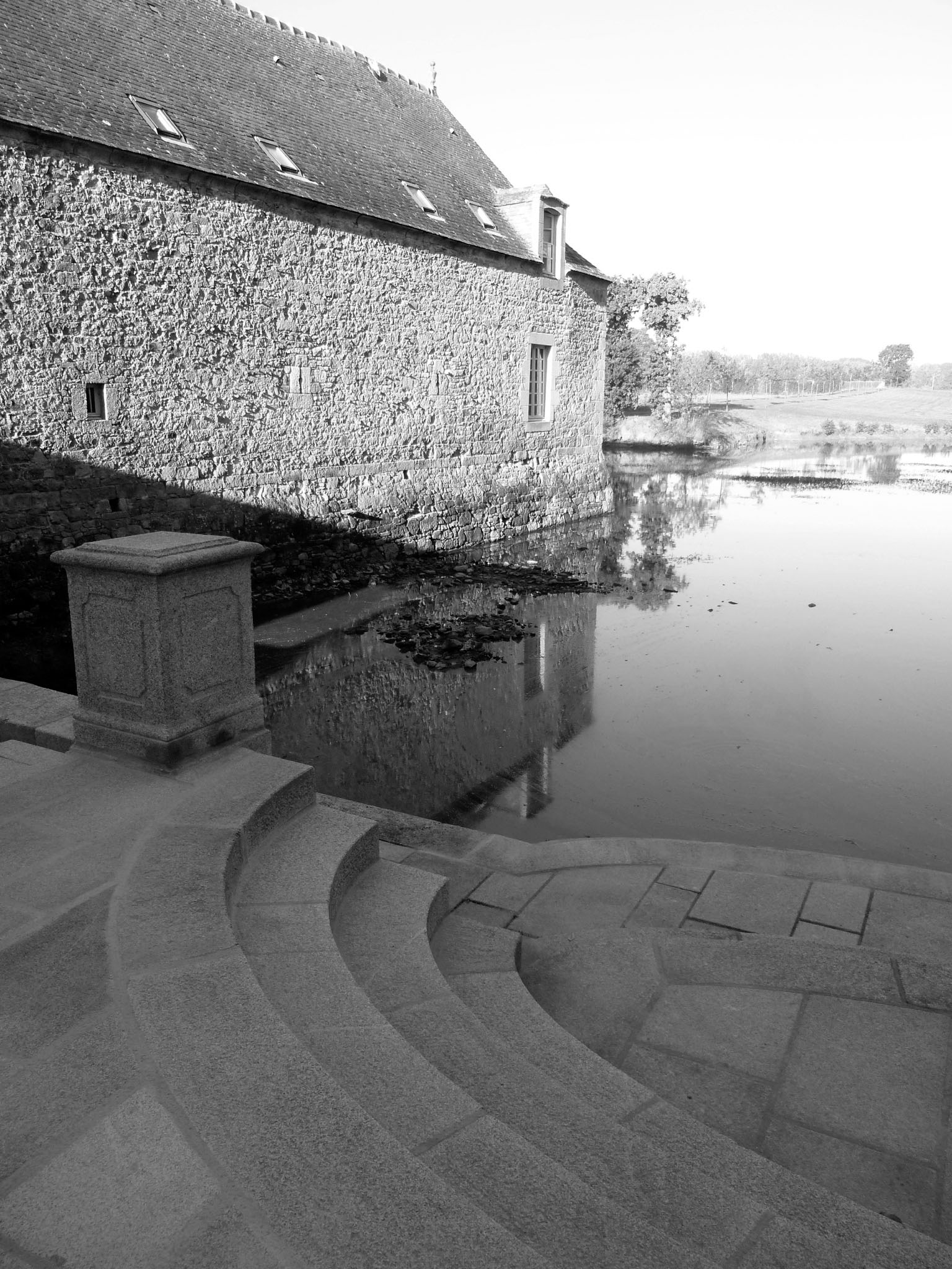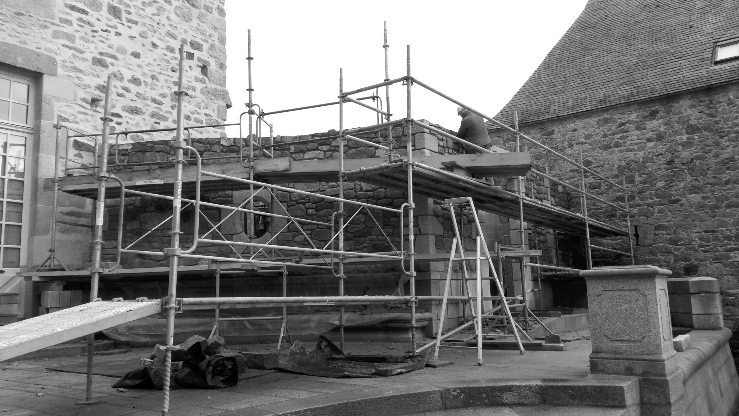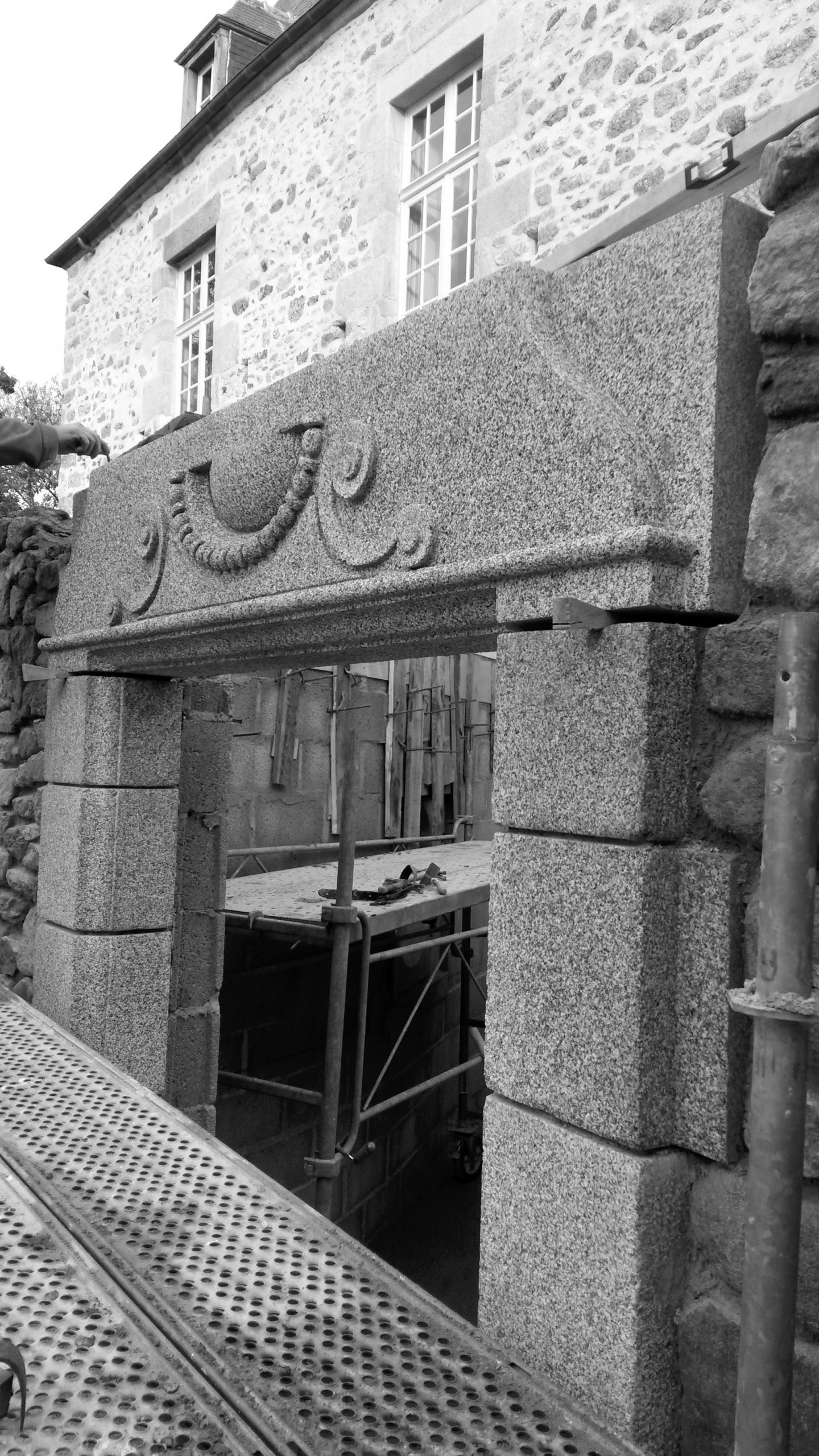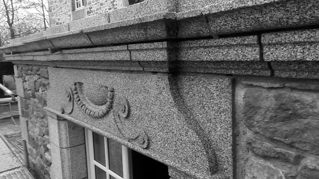 Création d'une terrasse en Granite de Languédias. Bancs courbes dont le design est inspiré des bancs du Pont-neuf à Paris.